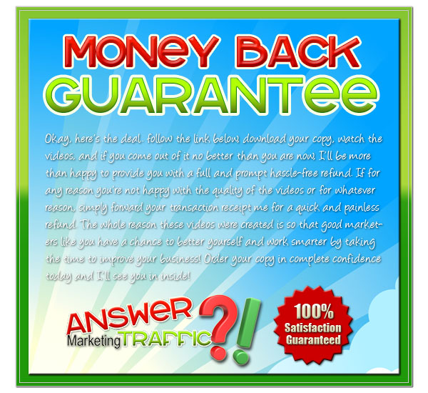 So order your copy of 'Answer Marketing Traffic' today in complete confidence! But just before you do, please rest assured that you are backed by a completely risk-free guarantee!..