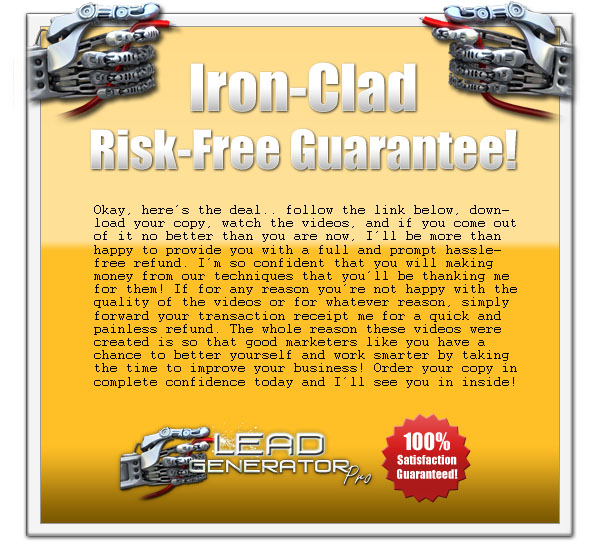 So order your copy of 'Lead Generation Pro' today in complete confidence! But just before you do, please rest assured that you are backed by a completely risk-free guarantee!..